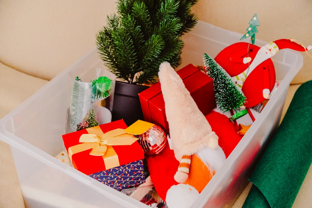 - Store fabric items in sealed bags inside bins, especially tree skirts and stockings.