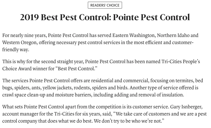 For the second straight year, Pointe Pest Control has been named Tri-Cities People’s Choice Award winner for “Best Pest Control.”